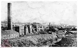 The ruins of Hirwaun Ironworks at the end of the nineteenth century. The photograph clearly shows the four blast furnaces, and to their right, the building which housed the puddling furnaces and rolling mills.